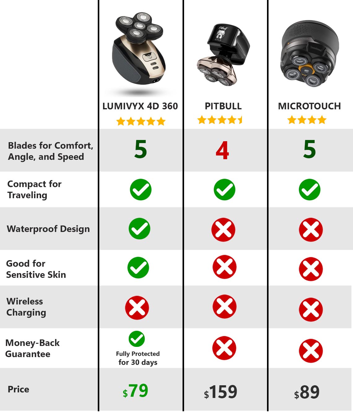 Overall, we loved the Lumivyx 4D - 360° Head Shaver the most – and at this price, it’s hard to beat.
