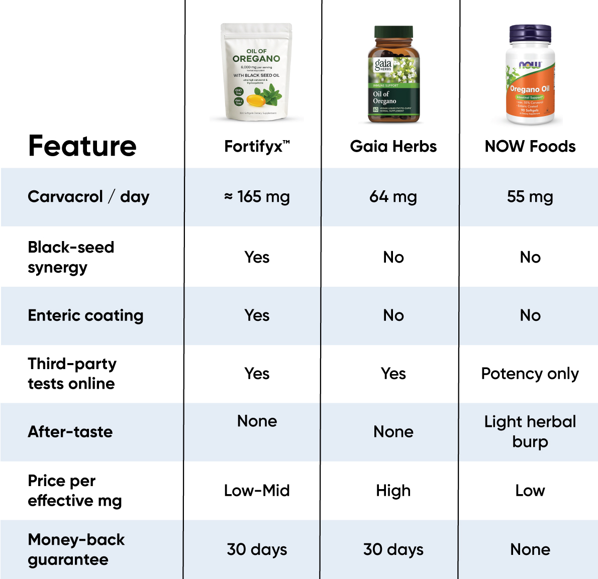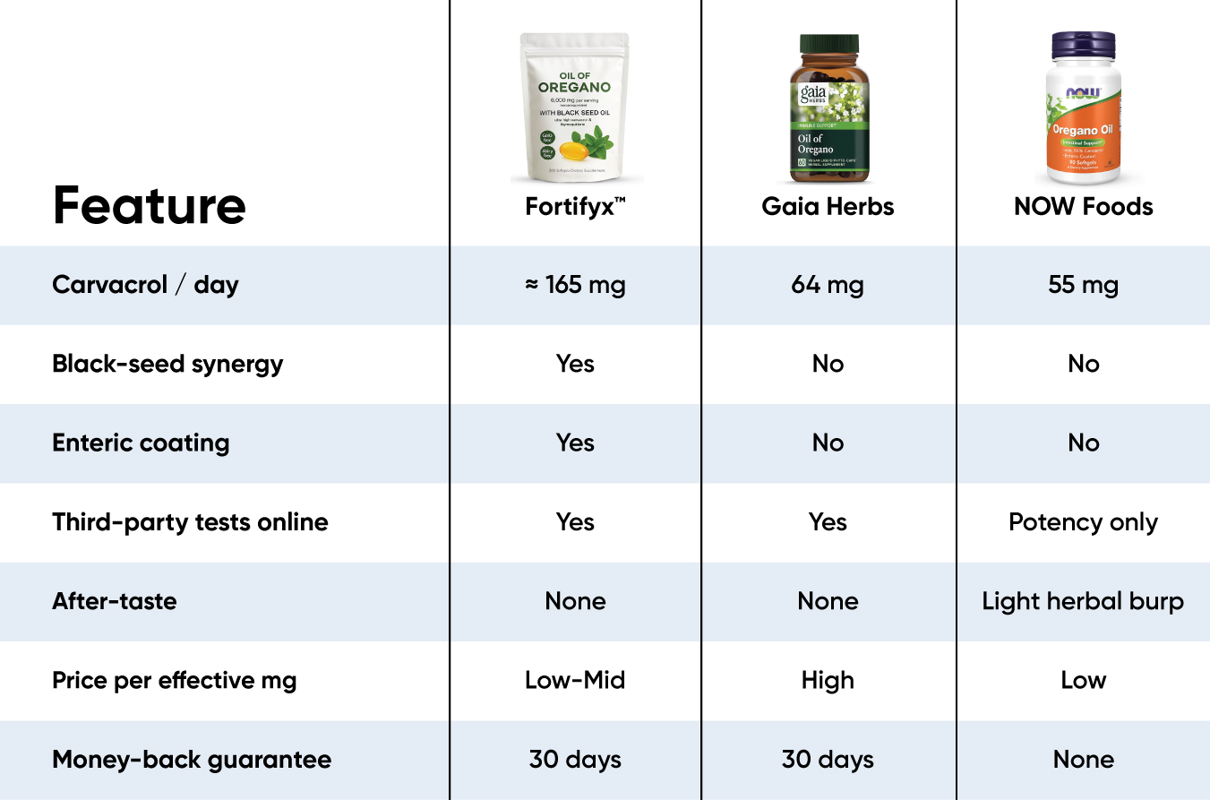 The first thing we noticed was zero oregano “pizza burp.” Fortifyx’s enteric shell kept its wild 60% carvacrol and black-seed thymoquinone locked away until the capsule hit the intestine - so no throat burn, just results.