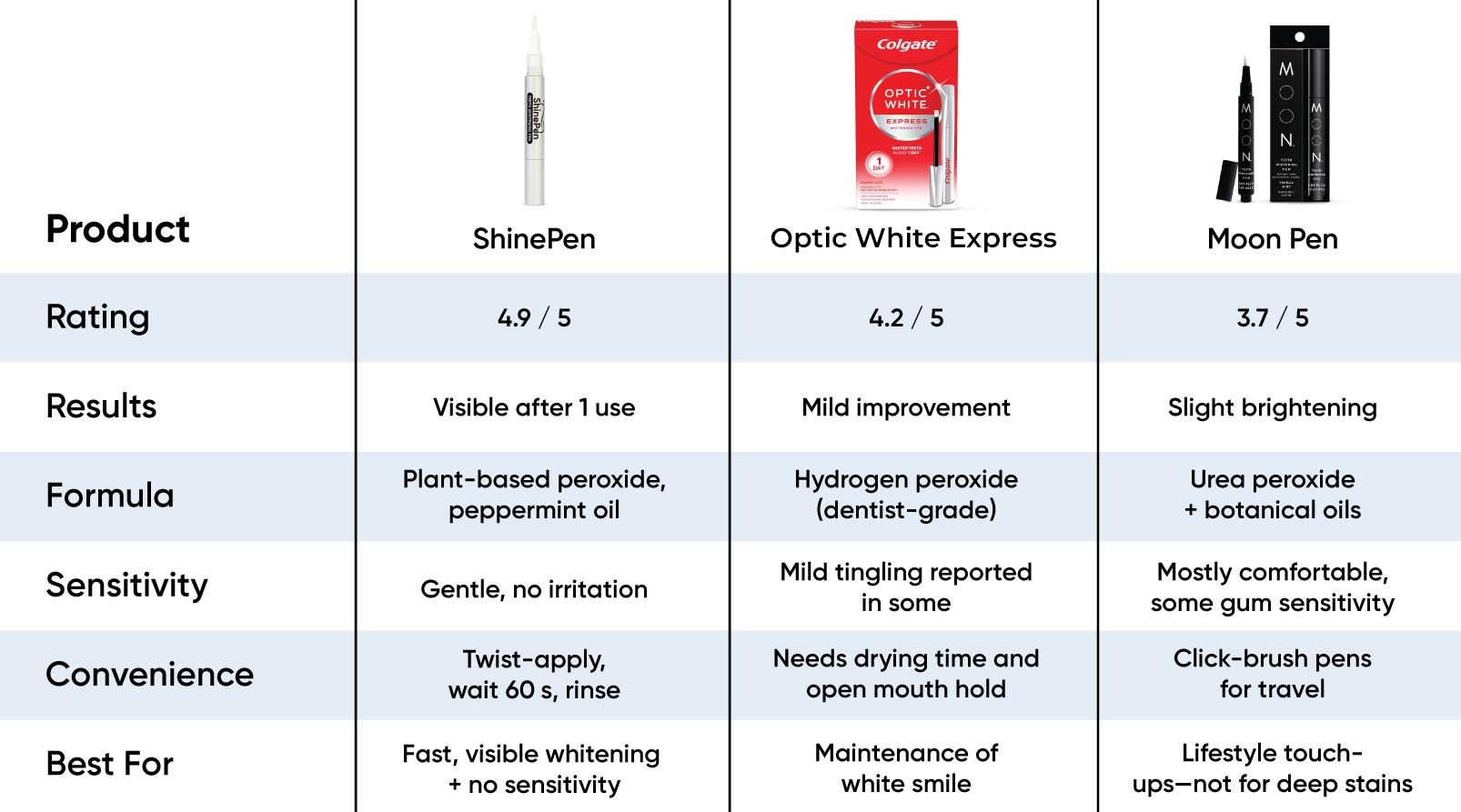 Each product was evaluated based on whitening effectiveness, comfort, sensitivity, ingredients, and real user feedback. While TrustedConsumerReviews shares a parent company with ShinePen, we remain committed to transparent, side-by-side reviews that focus on long-term results and overall value.
